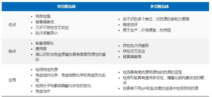 一般来说,单克隆抗体是诊断制造和治疗药物开发的理想选择,尤其是针对单个抗原表位需要大量相同抗体的应用。而对于一般性的研究应用,多克隆抗体比单克隆抗体具有特定的优势。