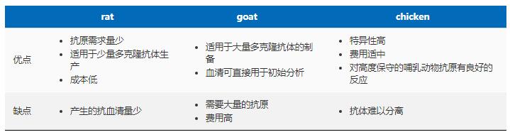 用于生产抗体的宿主具有许多种,最常见的两种是mice和rabbit。mice通常是用于产生单克隆抗体的宿主,具有免疫周期较短、成本较低等优势。mice-抗体可用于早期发现研究,体内临床前治疗研究,体外诊断。与mice相比,rabbit具有较高的成功率和更广泛的抗原适应范围。rabbit抗体可以识别更多种类的表位,与mice-抗体相比具有更高的亲和力和特异性。其它宿主如rat,goat和chicken等都具有各自的优缺点: