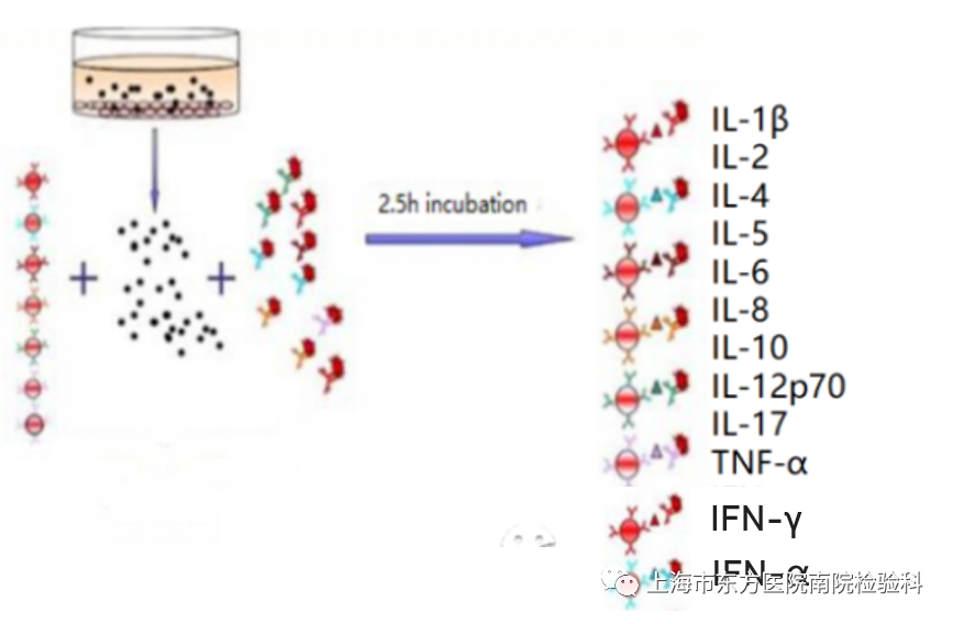 基于流式细胞术,通过已知体积大小和荧光强度的微球捕获12种可溶性蛋白(IL-1β、IL-2、IL-4、IL-5、IL-6、IL-8、IL-10、IL-12p70、IL-17、TNF-α、IFN-γ、IFN-α)并检测其含量。